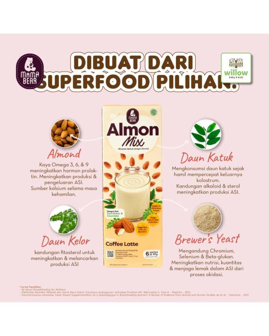 Almon Mix adalah terobosan produk minuman serbuk dengan almond yang kaya zat besi dan serangkaian vitamin. Dikombinasi dengan daun katuk sebagai bahan herbal terbaik untuk ibu menyusui, Almon Mix mengandung bahan- bahan alami yang memperkaya kualitas & jumlah ASI.