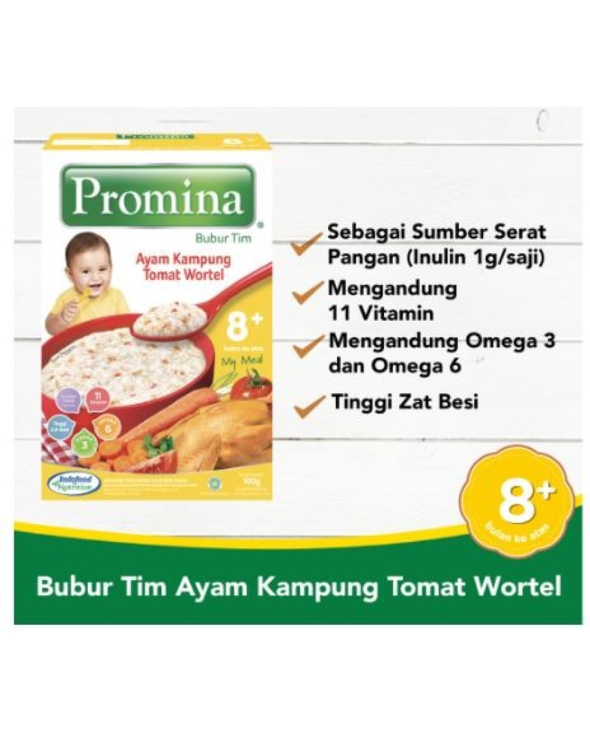 Promina Bubur Tim Ayam Kampung Tomat Wortel memiliki tekstur agak kasar yang dapat menstimulasi kemampuan mengunyah. Untuk anak usia 8 bulan ke atas. Keunggulan :
