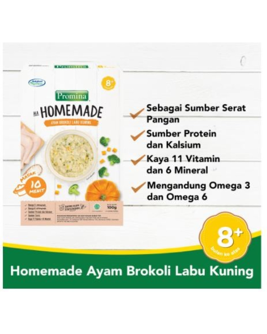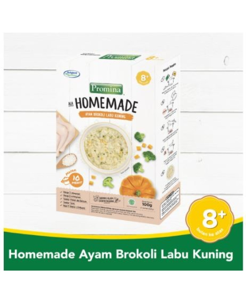 Promina Homemade adalah terobosan baru bubur dari Promina dengan proses pemasakan cukup 10 menit. Terbuat dari beras utuh, susu, daging dan sayuran kering. Promina Homemade dapat dikreasikan dengan makanan favorit si Kecil lainnya. Promina Homemade mengandung gizi lengkap dan tekstur tepat sesuai usia untuk perkembangan dan pertumbuhan otak dan fisik si Kecil. Dikhususkan untuk bayi 8 bulan keatas. Promina Homemade tersedia dalam 2 varian yaitu Salmon Kentang Wortel dan Ayam Brokoli Labu Kuning.