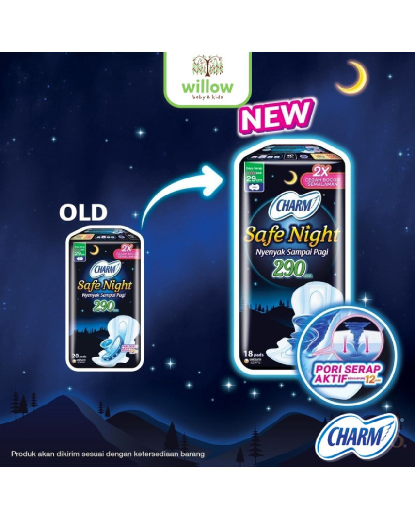 CHARM Safe Night 29cm, panjang hingga kebagian belakang. Memberikan perlindungan anti bocor belakang, rasa aman dan nyaman untuk tidur semalaman. Nyenyak sampai pagi!
