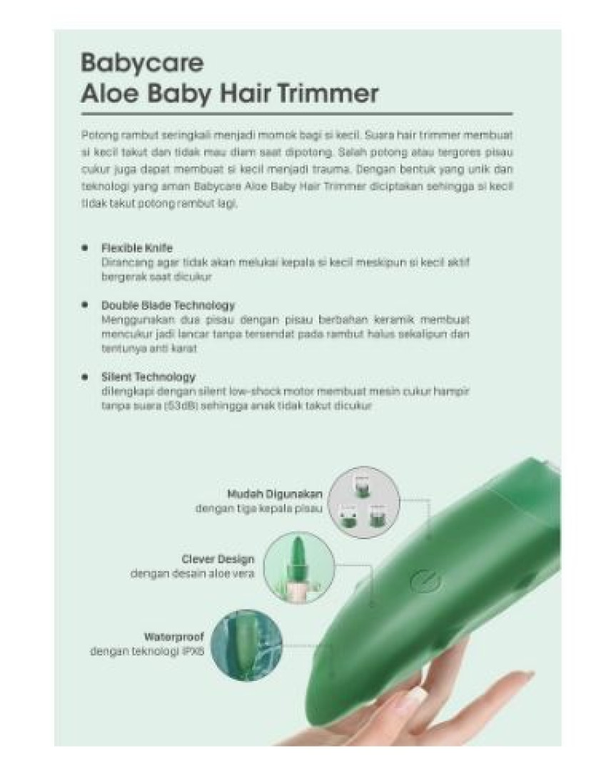 Babycare mengerti dan menciptakan alat cukur yang hampir tanpa suara sehingga tidak membuat si kecil takut untuk dicukur. Dengan bentuk yang lucu dan dilengkapi pisau yang dirancang sesuai bentuk kepala membuat kulit kepala si kecil tidak akan tergores meskipun si kecil aktif bergerak.