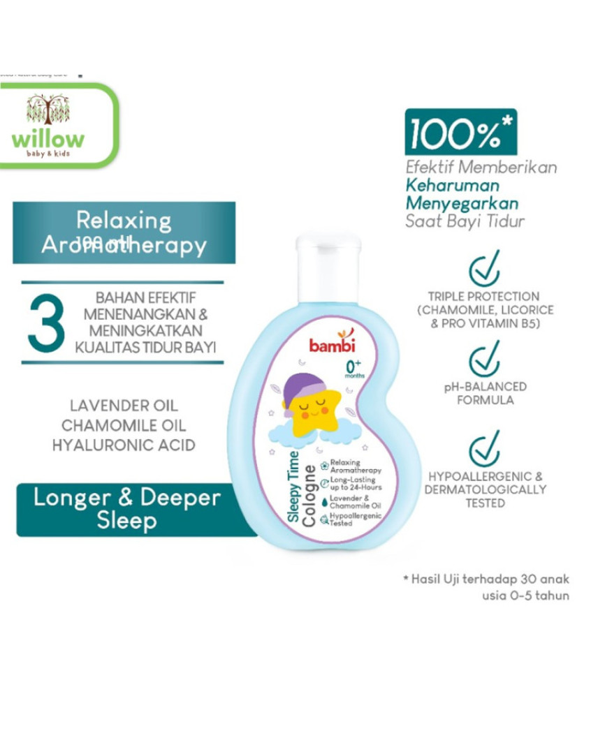 Bambi Baby Sleepy Time Relaxing Cologne ● Cologne Aromatherapy yang diperkaya dengan Lavender amp; Chamomile Oil yang secara klinis terbukti dapat membantu menenangkan dan memberi kenyamanan pada bayi, sehingga membantu bayi untuk tidur lebih cepat dan nyenyak. ● Dilengkapi dengan kandungan Chamomile Extract, Pro Vitamin B5 amp; Licorice yang dapat melindungi kulit bayi dari iritasi ringan. Bayi bangun lebih segar dan ceria.