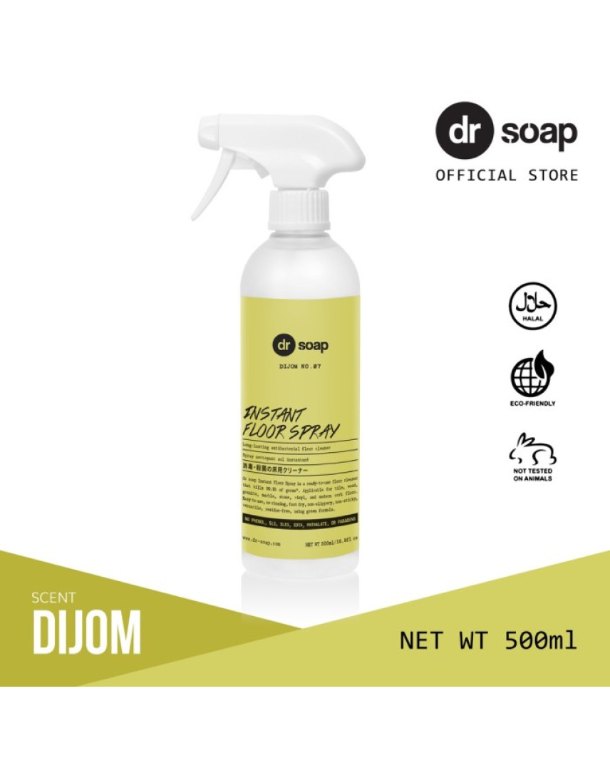 dr soap Instant Floor Spray adalah pembersih lantai dengan inovasi terbaru siap pakai yang sekaligus dapat membunuh 99.9% kuman*. Dapat digunakan untuk ubin, kayu, granit, marmer, batu, vinil, dll; untuk membersihkan tumpahan dan noda, membuat kilap serta menjauhkan kita dari kuman & bakteri. Kemasan menggunakan penyemprot yang memiliki 4 fitur berbeda yang dapat disesuaikan dengan kebutuhan penggunaan. Pembersihan cepat & mudah, cepat kering, tidak licin, tidak lengket, serbaguna, bebas residu, dengan bahan-bahan alami (aman untuk lingkungan, bayi, dan lansia). Dapat mencegah penyebaran penyakit menular dan mengendalikan alergen.