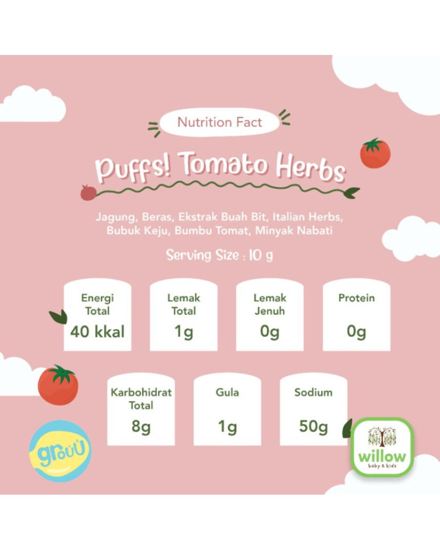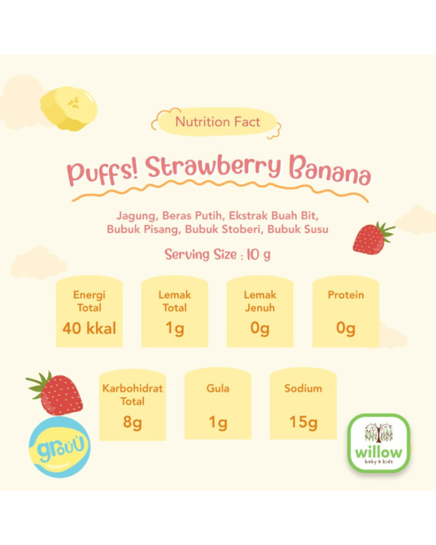 Camilan Puffs Baru dari Grouu yang terbuat dari beras dan buah pilihan serta mudah lembut di mulut sehingga aman dikonsumsi untuk si kecil.