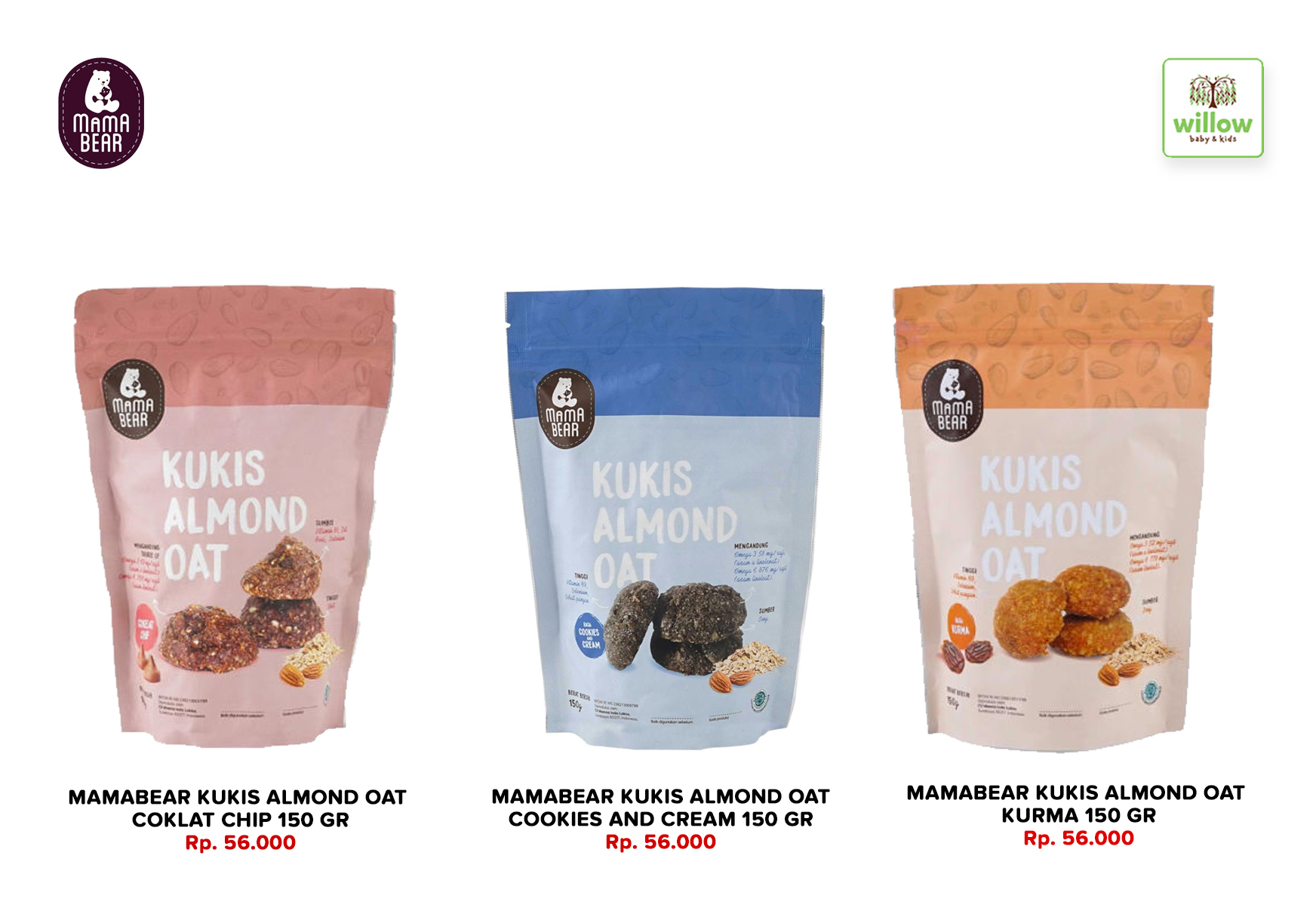 Dari segi kemasan, Mama Bear Kukis Almond Oat berbentuk ziplock, sehingga mudah dibuka dan ditutup kembali. Jadi kalau tidak habis, Willow Mom bisa menyimpan kembali kukis ini. Selain itu, kukis ini juga bisa tahan selama dua minggu. Ada tiga varian rasa, diantaranya Mama Bear Kukis Almond Oat rasa kurma, cookies and cream, dan chocochips.