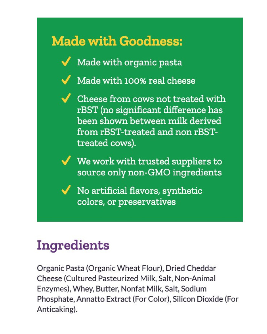 description Made With Organic Pasta Rabbit of Approval- Totally Natural 100% Real Cheese No Artificial Anything! 0 g Trans Fat Naturally Good Source of Calcium and Protein See Nutrition Information For Sodium Content Certified Organic by Oregon Tilth Suggested Use Annie's Way in 10 Minutes 1. Boil: 6 cups water in a medium saucepan. 2. Stir in: pasta, bring to boil. Cook: 8-10 minutes, or until done, stirring occasionally. 3. Drain Pasta: in colander. While pasta is draining... 4. Add: 3 Tbsp lowfat milk to the warm saucepan. (Optional: Add 2 Tbsp unsalted butter for richer flavor) 5. Sprinkle: cheese over milk; stir to combine. 6. Add: cooked pasta back to saucepan and stir well. Enjoy! Annie's Suggestions: For a richer flavor, add 2 Tbsp unsalted butter. For a creamy, tangy version, replace milk with 1/2 cup lowfat yogurt. Other Ingredients Organic wheat shell pasta, cheddar cheese (cultured pasteurized milk, salt, non-animal enzymes), whey, butter, nonfat milk, salt, sodium phosphate. Contains milk and wheat ingredients. Made on shared equipment that also processes egg and soy. Keep in a cool, dry place.