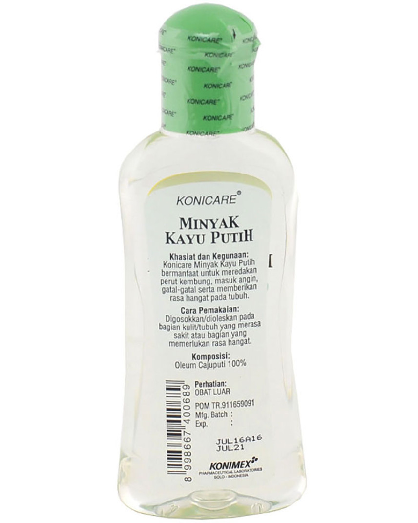 Konicare Minyak Kayu Putih adalah minyak kayu putih yang diformulasi khusus untuk kulit orang dewasa karena kehangatan yang berbeda dengan minyak telon khusus bayi dapat membantu meredakan perut kembung, mencegah masuk angin, mengobati gatal-gatal, memberikan rasa hangat pada tubuh Anda, serta melindungi kulit Anda dari gigitan nyamuk.