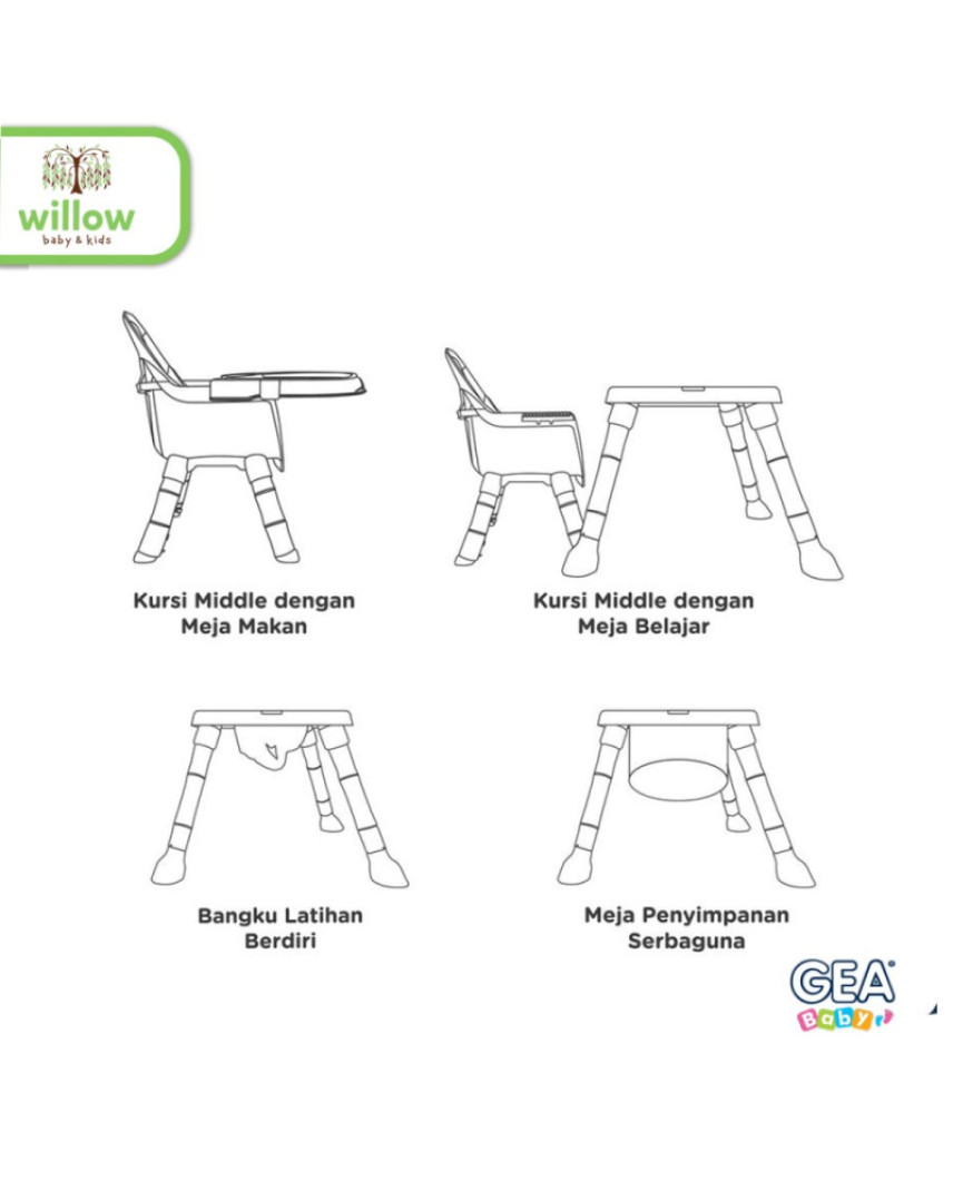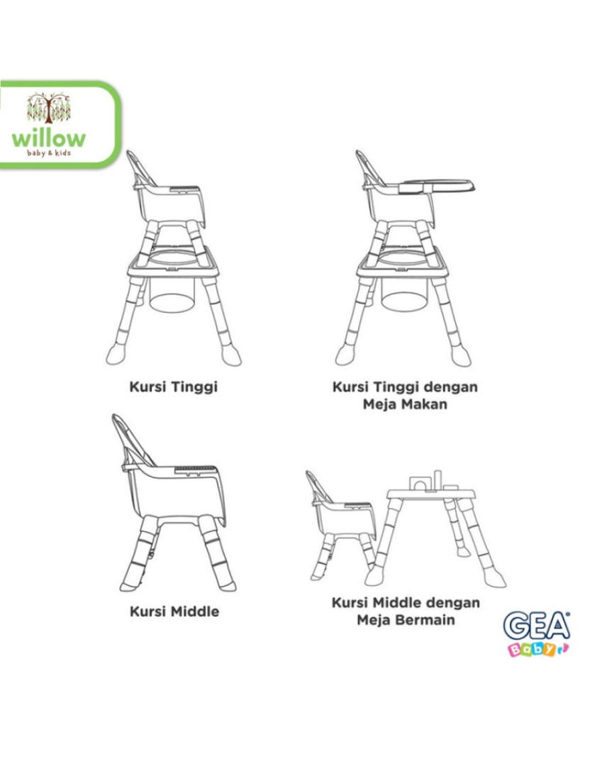 GEA Baby Swappy High Chair & Booster GHC-400 adalah kursi multifungsi yang didesain untuk memberikan kenyamanan dan kemudahan bagi si kecil di berbagai tahap perkembangan. Berfungsi sebagai kursi makan, meja bermain, meja belajar, tempat belajar berdiri, dan bahkan area penyimpanan tambahan untuk perlengkapan anak.