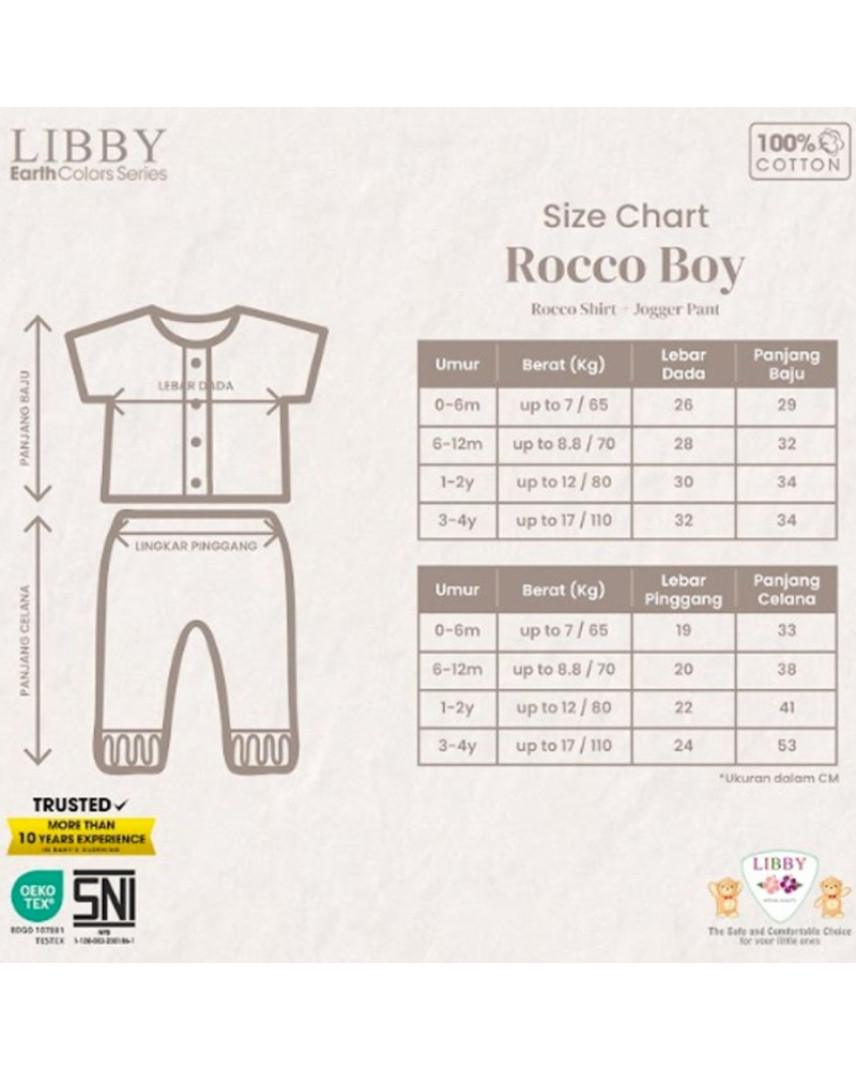 Terinspirasi dari alam sekitar, Libby mengeluarkan series earth colors dalam koleksi terbarunya. Stelan baju kancing lengan pendek dan celana panjang untuk Bayi dan anak alki-laki usia Newborn hingga anak usia 4 thn.