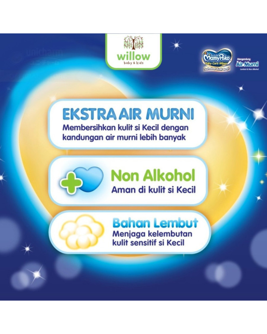 Mamypoko menghadirkan tisu basah berukuran tebal dengan teksturnya yang lembut dan menyegarkan khusus si kecil. Tisu basah ini idealnya digunakan pada saat mengganti ataupun melepas popok si kecil. Selain itu, produk tisu basah ini terbuat dari bahan bebas alkohol, sehingga cocok untuk bayi yang sekalipun memiliki kulit sensitif.