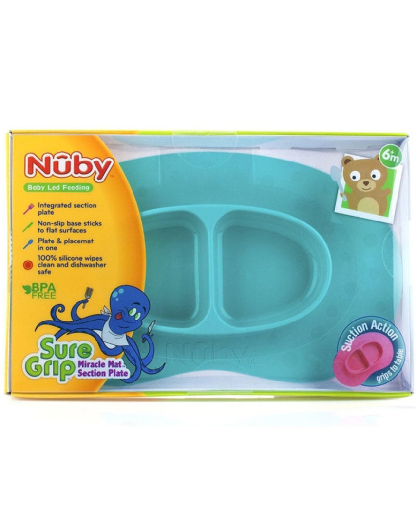 NUBY Sure Grip Mat with Section merupakan piring makan anak dengan 2 bagian terpisah yang dapat menampung 2 menu yang berbeda. Terbuat dari silikon lembut yang bebas BPA serta mudah untuk dibersihkan dan digunakan kembali. Bagian bawah piring yang terbuat dari silikon membuat piring tidak mudah bergeser ataupun tumpah saat digunakan.