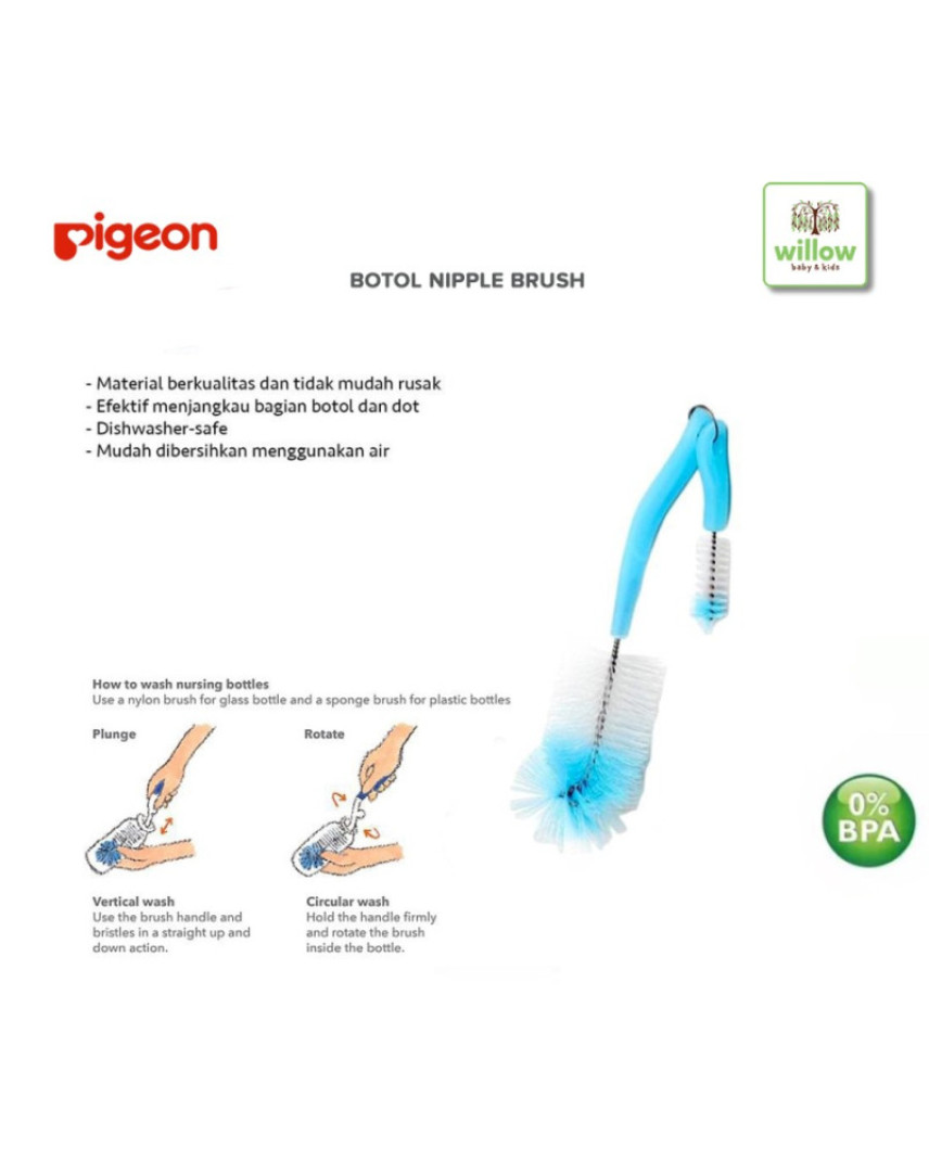 Set berisi 2 sikat untuk membersihkan botol susu dan dot bayi. Bulu sikat terbuat dari bahan spons dan nilon yang lembut dan efektif membersihkan sisa lemak susu yang menempel pada botol. Padatnya bulu sikat pada sikat nilon dapat menghilangkan noda membandel, sementara sudut-sudut yang sulit dijangkau akan dengan mudah dibersihkan menggunakan sikat spons yang fleksibel.