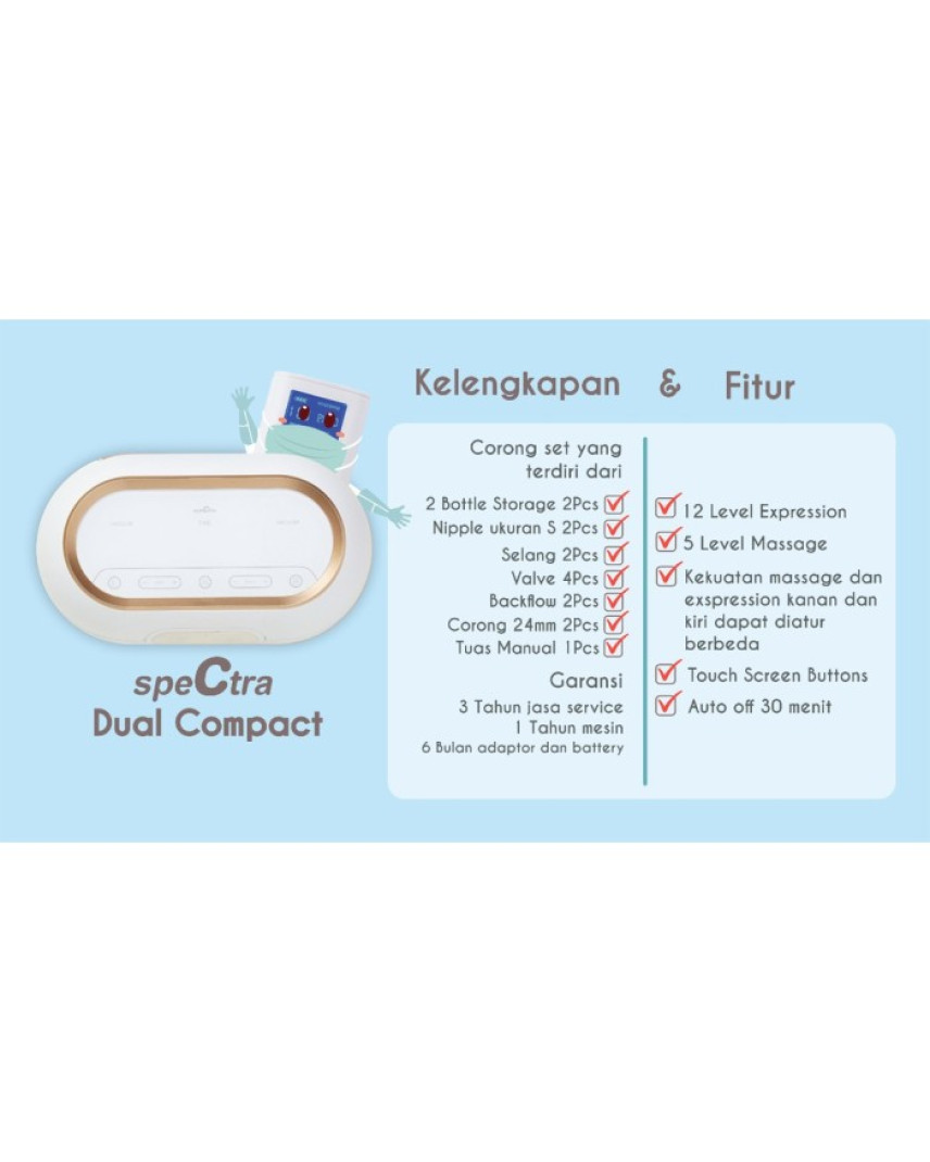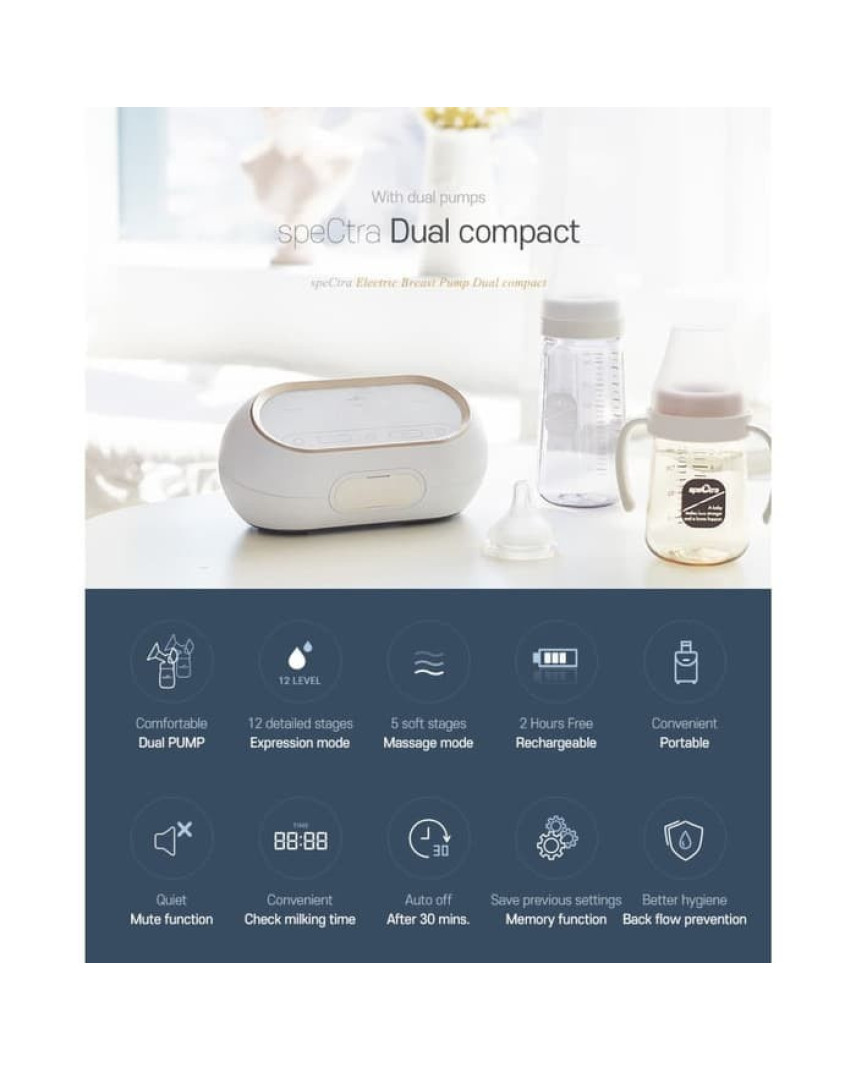 SPECTRA BREASTPUMP DUAL COMPACT merupakan versi kecil dan ekonomis dari Spectra Dual S. Spectra Dual compact tidak termasuk dalam kategori pompa asi besar maupun kecil, karena merupakan line up baru dari spectra. Berat mesin : 0.65gram